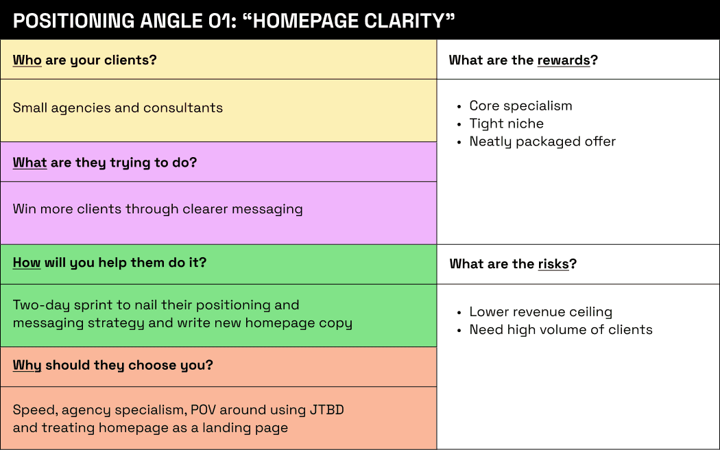 I'll present you with three positioning directions based on my research, help you choose which one is right for you, and make sure everyone is aligned.